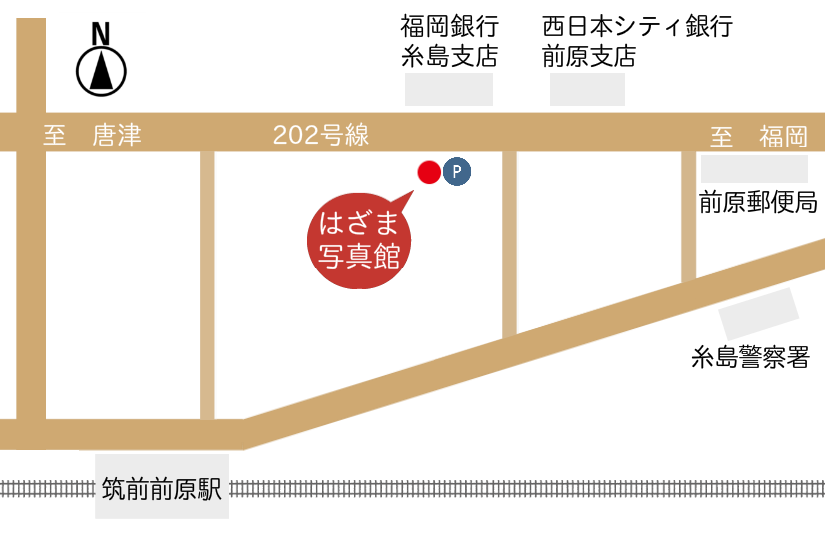 | 電車でお越しの方へ | 最寄駅:筑前前原駅より徒歩5分 ※福岡銀行糸島支店前、3階建ての写真館です。 |